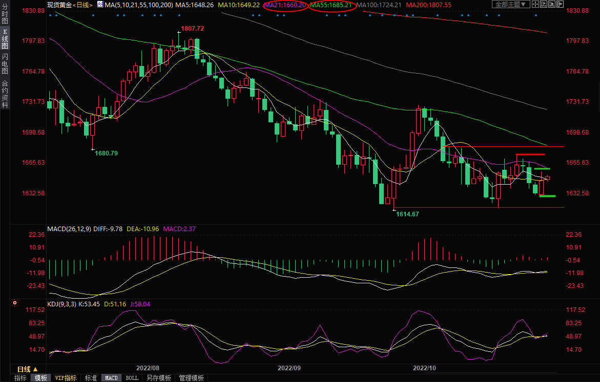日线级别:震荡;MACD粘合,KDJ粘合,均线交织,短线走势变数较大,上方留意21日均线1660.19附近阻力,若能顶破该阻力,增加短线看涨信号;进一步阻力在10月26日高点1674.77附近,强阻力在10月11日高点1683.83附近,也可以参考55日均线1685.20附近阻力。