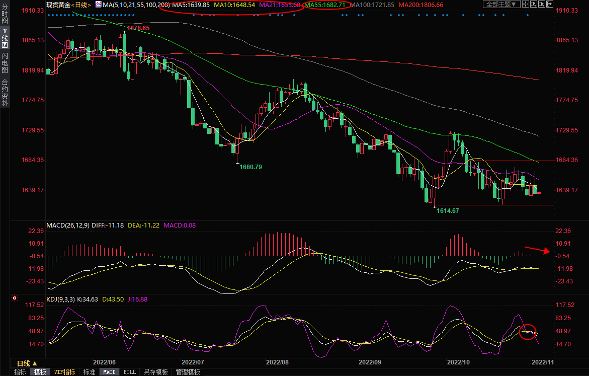 日线级别:震荡;金价回落至所有均线下方,5日均线下穿10日均线,KDJ死叉运行,短线看空信号有所增加,初步支撑在本周低点1630.53附近,如果失守该支撑,金价料将重新试探10月21日低点1614.67附近支撑,进一步支撑在1600整数关口附近。