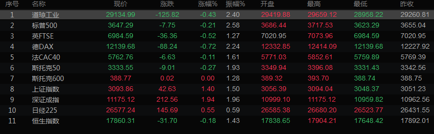 美股收盘情况:道琼斯工业指数下跌0.43%,收报29134.99点;标普500指数下跌0.21%,至3647.29点;纳斯达克指数攀升0.25%,至10829.50点。