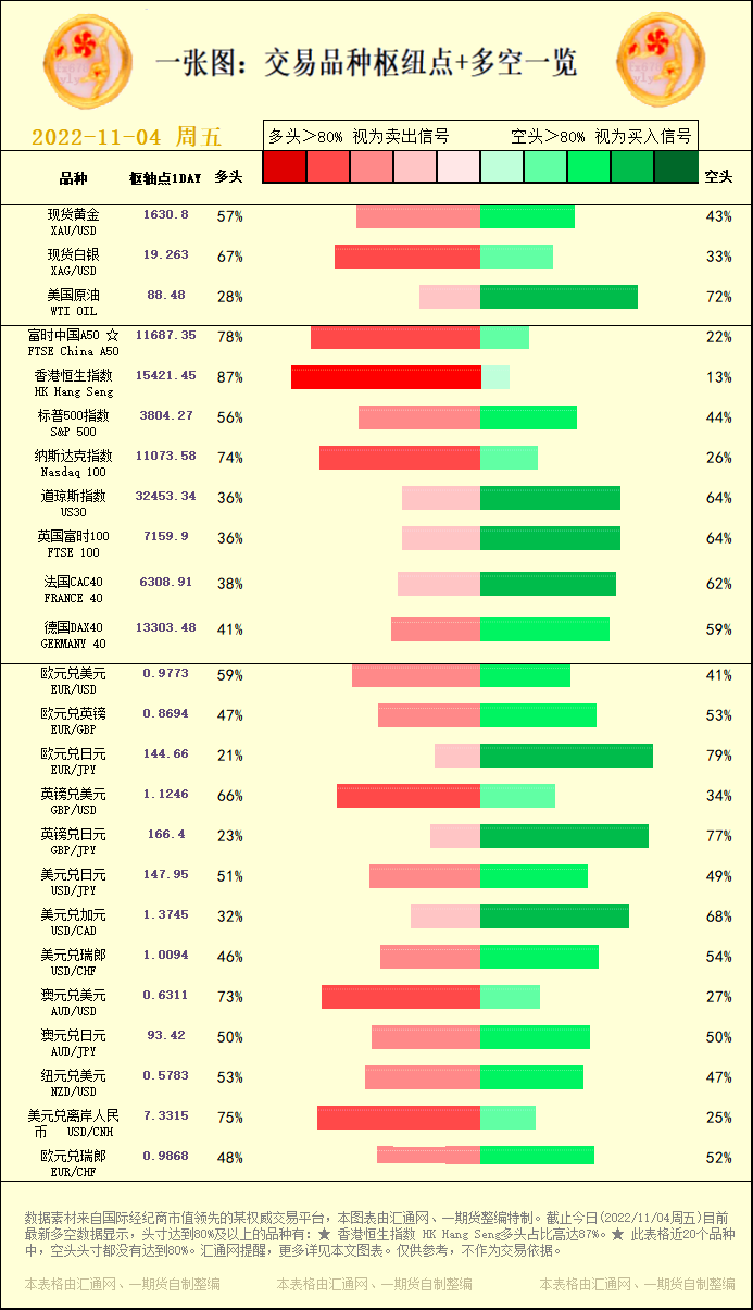 一张图:交易品种枢纽点+多空占比一览。截止今日(2022/11/04周五)目前最新多空数据显示,头寸达到80%及以上的品种有:★ 香港恒生指数 HK Hang Seng多头占比高达87%。★ 此表格近20个品种中,空头头寸都没有达到80%。汇通网提醒,更多详见本文图表。仅供参考,不作为交易依据。