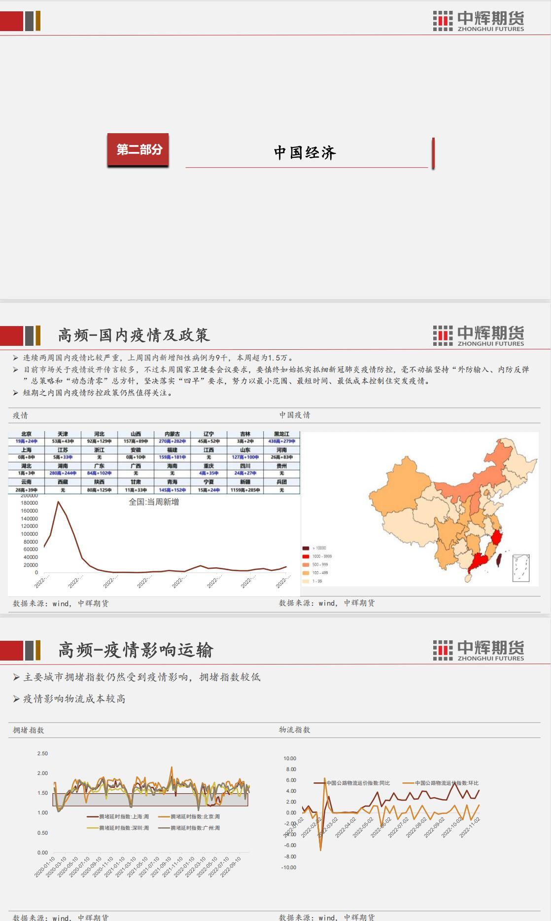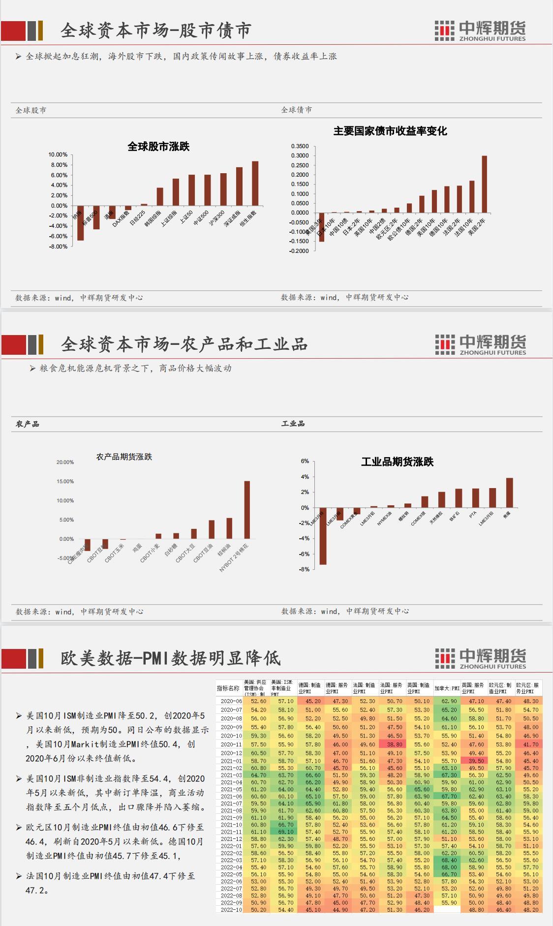 全球:加息潮,全球风险资产大幅走低,债券市场利率明显走高低,商品大波动,国内A股政策传闻走高海外:通胀没有去化趋势,美联储引领多国采取激进加息。国内:国内疫情影响高频数据,猪肉鸡蛋价格上涨,汽车销售积极,货币市场流动性充裕,房地产成交有好转迹象。结论:国内政策重心将转移到促经济发展上来,关注经济恢复和市场信心恢复,国家卫健委重申动态清零,短期关注国内疫情及政策情况。海外,欧美通胀仍然超预期,全球处于最紧缩的货币流动潮,经济下行明显。美联储加息落地,短期处于政策真空期,关注产业上下游博弈。风险:全球经济增速下滑超预期,海外货币收紧超预期
