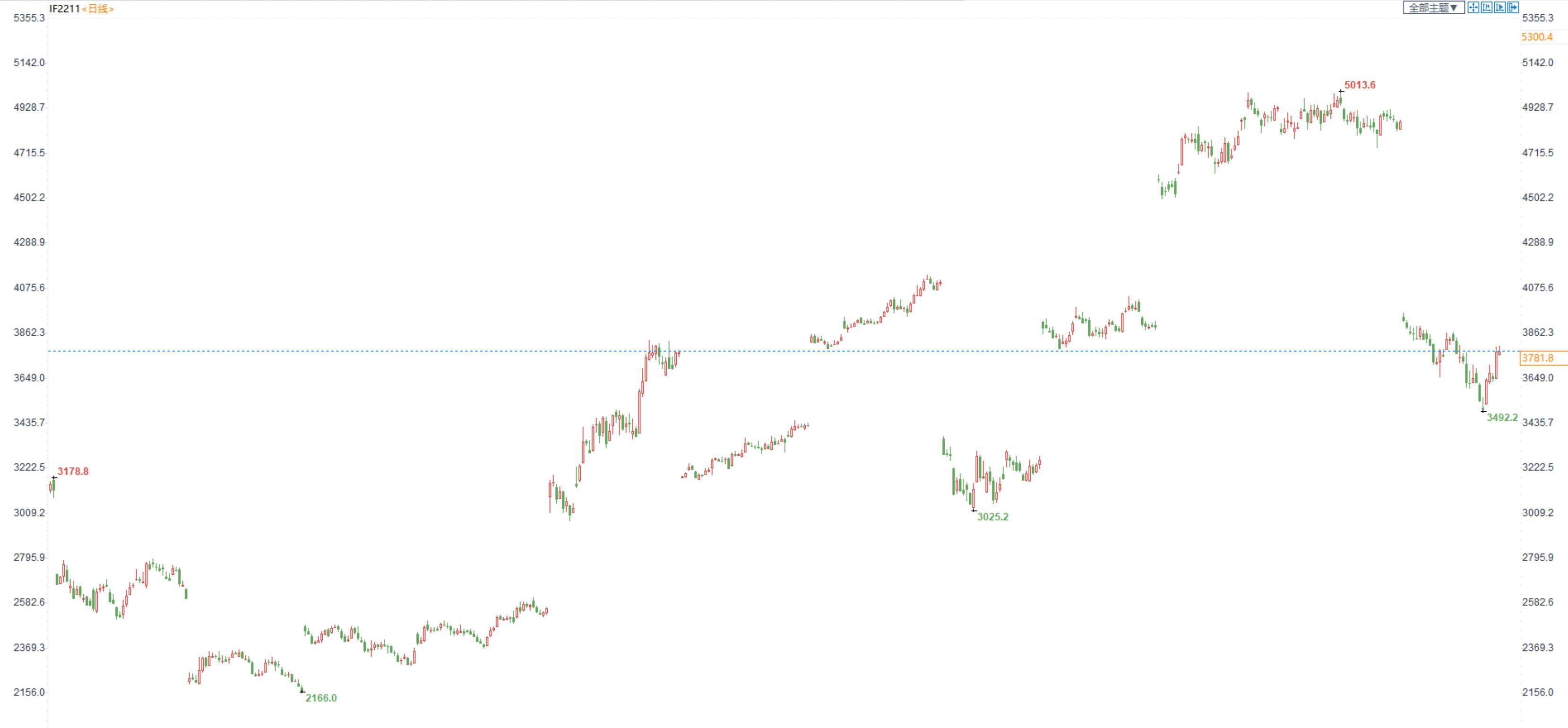 【今日行情】四大期指涨跌弧线。IH2211收盘价为2476.6,收涨0.22%;IF2211收盘价为3781.8,收涨0.02%;IC2211收盘价为6136.4,收跌0.20%;IM2211收盘价为6711.8,收跌0.29%。今日市场上涨动能减弱,窄幅震荡为主,消费者服务跌幅居前。两市超3100只个股收涨,市场成交额连续第2个交易日冲上万亿,录得10070.26亿元。