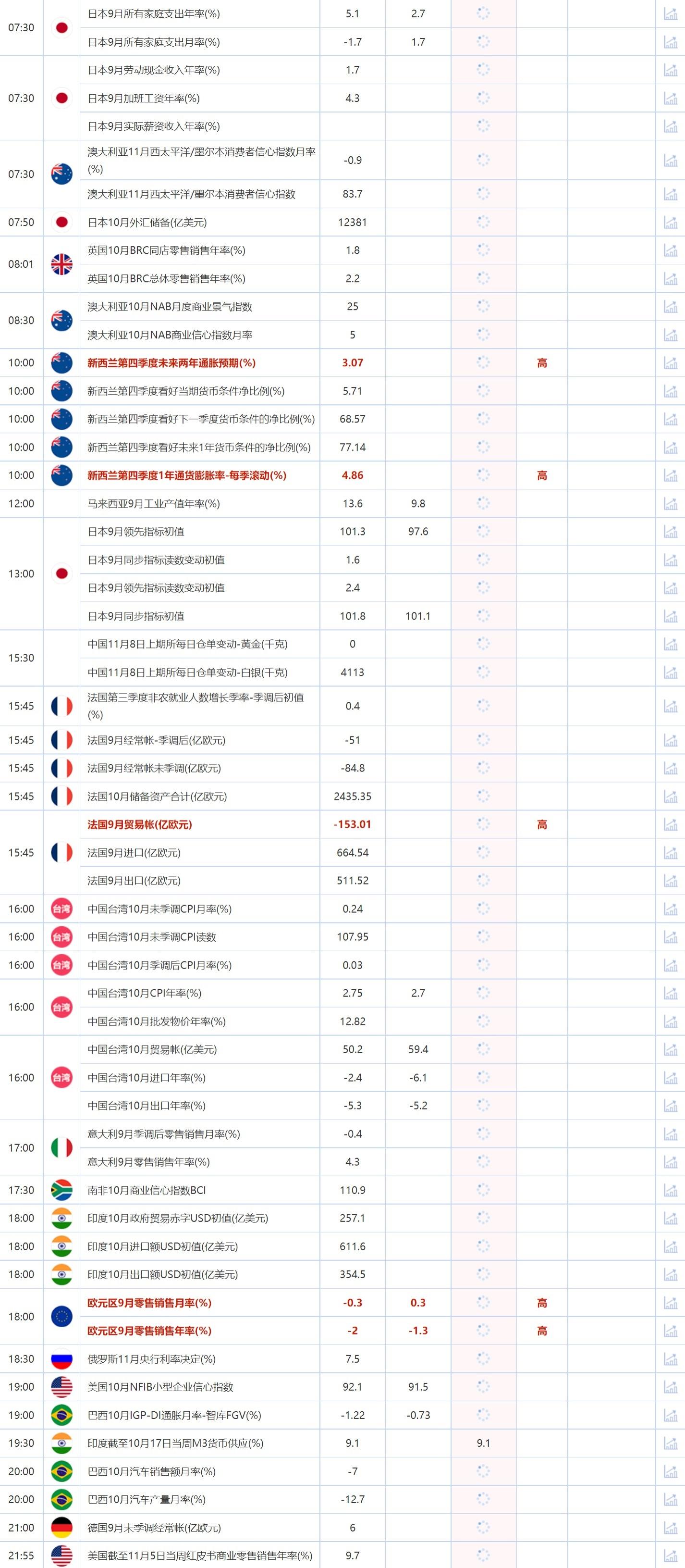 07:30 日本9月劳动现金收入年率(%) , 前值 1.7 , 预期值 -- , 公布值:待发布