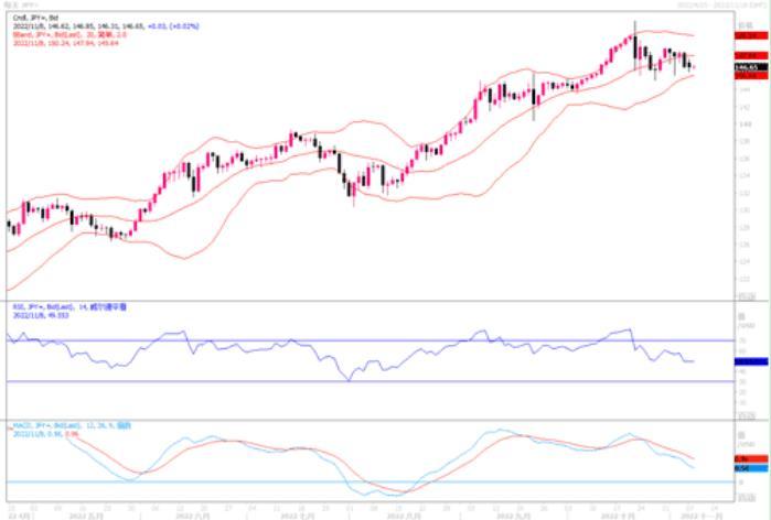 周一受美元指数走软影响,美元/日元下跌,小幅收低。当天开盘147.14,收盘146.62。