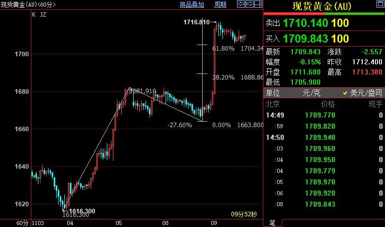 北京时间14:53,现货黄金下跌0.13%至1709.80美元/盎司;COMEX期金主力合约下跌0.17%至1713.0美元/盎司;美元指数上浮0.11%至109.753。