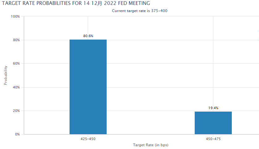 市场参与者现在认为,美联储在12月会议上至少加息50个基点,但连续第五次加息75个基点的可能性不到20%。黄金被视为通胀对冲工具,但利率上升会增加持有非孳息资产黄金的机会成本。