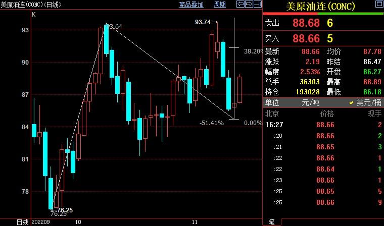 北京时间16:33,NYMEX原油期货上涨2.68%至88.79美元/桶;ICE布伦特原油期货上涨2.59%至96.10美元/桶。
