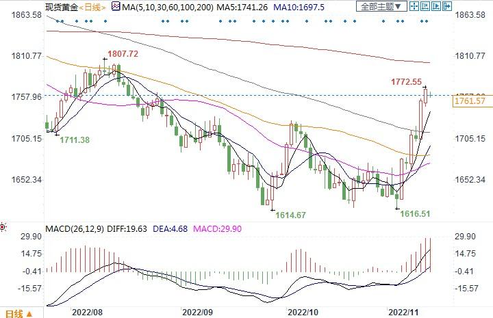 德国商业银行分析师Carsten Fritsch表示:“美国10月CPI升幅远低于预期,从而抑制了美联储加息预期,令美元承压,并导致美国国债收益率明显下滑。其结果是,金价攀升至每盎司1760美元,达到8月底以来的最高水平。”