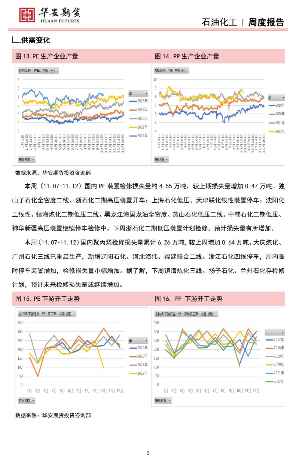 美高通胀情况缓解,市场情绪性好转。两油出厂价格部分下调,现货市场报盘窄幅整理为主,部分有所上探;场内观望氛围浓郁,但询盘积极性不高,终端多低价刚需补库,实单成交一般。拉丝主流徘徊在 7750-8050 元/吨。塑膜企业利润压力仍存,牵制厂家开工积极性。加之目前受疫情影响,物流交通运输不便,塑膜行业整体订单跟进有限,工厂出货刚需为主。综合来看塑膜业者开工积极性一般,多维持前期开工水平为主。预计短期 PP 市场小幅反弹。操作策略:建议投资者偏多思路对待。
