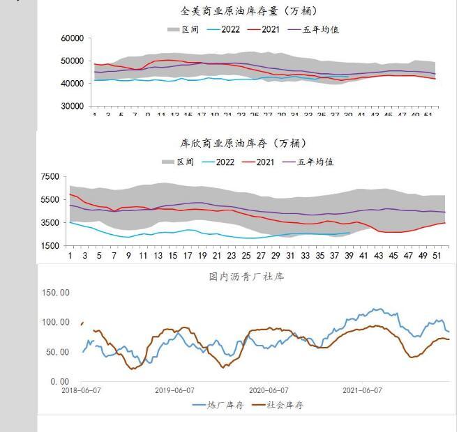 供应端:据美国能源信息署最新数据显示,截止2022年10月14日当周,包括战略储备在内的美国原油库存总量8.42492亿桶,比前一周下降528.9万桶;美国商业原油库存量4.37357亿桶,比前一周下降172.5万桶;战略原油库存量4.05135亿桶,比上一周下降356.4万桶;美国汽油库存总量2.09368亿桶,比前一周下降11.4万桶。商业原油库存比去年同期高2.54%,比过去五年同期低1.67%;汽油库存比去年同期低3.84%,比过去五年同期低约7.43%;馏份油库存比去年同期低15.32%,比过去五年同期低22.43%。
