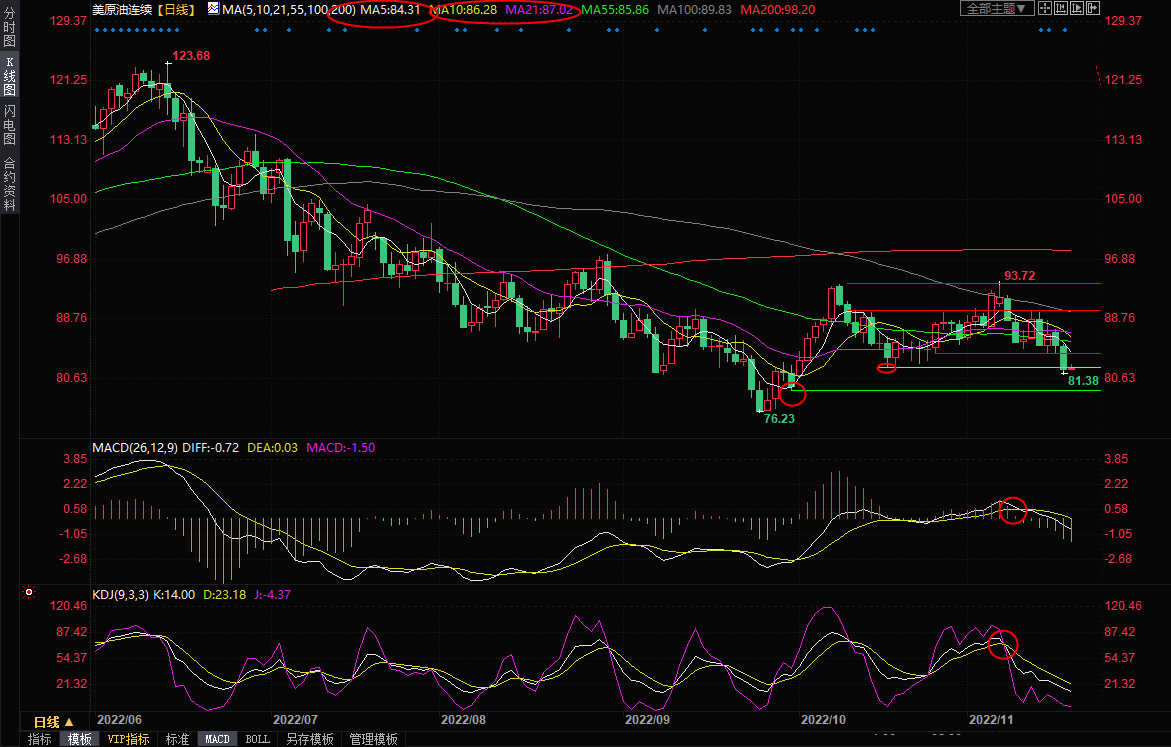 在跌破82.00关口前,油价仍留有震荡反弹调整的可能性,上方初步阻力在5日均线84.30附近,55日均线阻力在85.65附近,若能强势收复该位置,则削弱后市看空信号;进一步阻力在21日均线87.01附近,100日均线阻力目前在89.83附近。