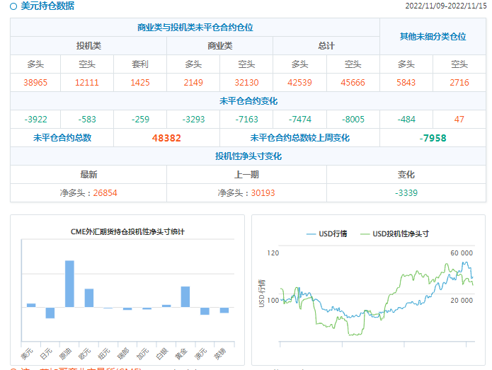 汇通网CFTC持仓数据:截至11月15日当周,美元净空头头寸为1050万美元,此前一周净多头头寸为23.6亿美元,为2021年7月中旬以来首次。11月15日当周,投机者所持原油净多头头寸减少49975手合约,至401767手合约。