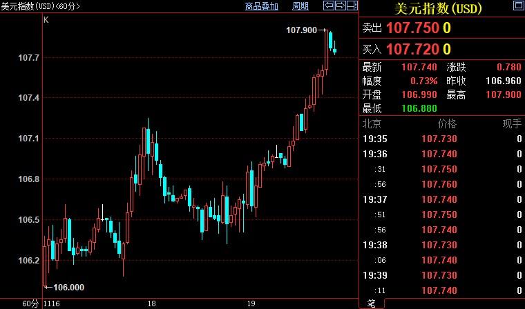 北京时间19:39,现货黄金下跌0.54%至1740.08美元/盎司;COMEX期金主力合约下跌0.72%至1741.7美元/盎司;美元指数上涨0.69%至107.746。