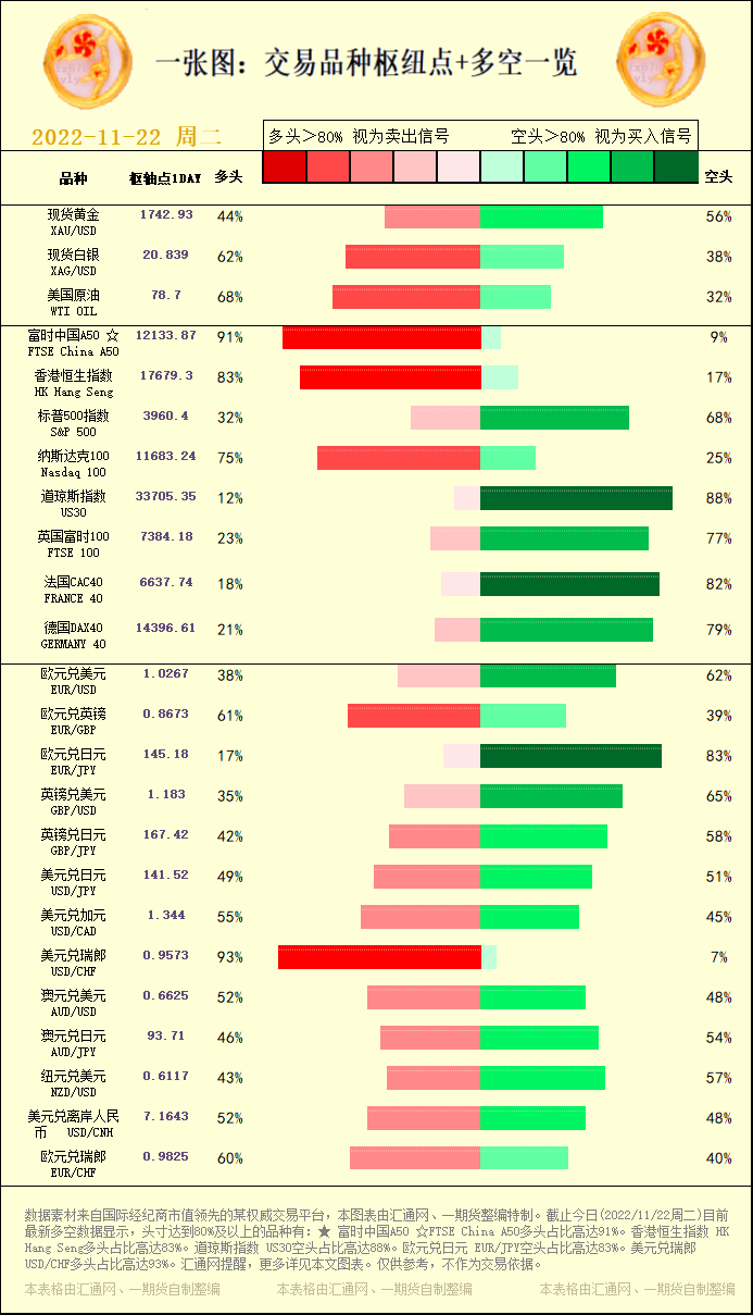 一张图:交易品种枢纽点+多空占比一览。截止今日(2022/11/22周二)目前最新多空数据显示,头寸达到80%及以上的品种有:★ 富时中国A50 ☆FTSE China A50多头占比高达91%。香港恒生指数 HK Hang Seng多头占比高达83%。道琼斯指数 US30空头占比高达88%。欧元兑日元 EUR/JPY空头占比高达83%。美元兑瑞郎 USD/CHF多头占比高达93%。汇通网提醒,更多详见本文图表。仅供参考,不作为交易依据。