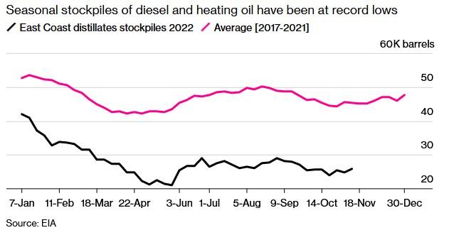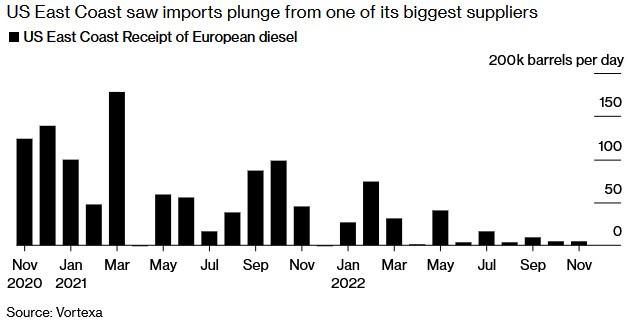 美国也停止了从俄罗斯进口柴油,而俄罗斯是去年美国东海岸最大的柴油供应来源。如今,美国东海岸地区的柴油短缺已经迫使供应商实施定量配给,并启动了应急协议,而冬天甚至还没开始。