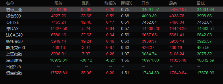 美股收盘情况:道琼斯工业指数上涨0.28%,至34194.06点;标普500指数上涨0.59%,至4027.26点;纳斯达克指数上涨0.99%,收于11285.32点。