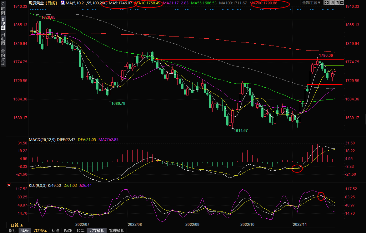 日线级别:震荡上涨;MACD金叉信号延续,金价连续三个交易日金价都守住了9月12日高点1735.02附近支撑,初步宣告完成了对该位置的回踩确认,短线回调结束,金价有望重拾涨势,初步阻力在10日均线1758.55附近,11月18日(上周五)高点阻力在1767.58附近,然后是1780关口附近阻力,近期高点阻力在1786.36附近,200日均线在1800关口附近,新一轮涨势目标位参考8月10日高点1807.72附近。