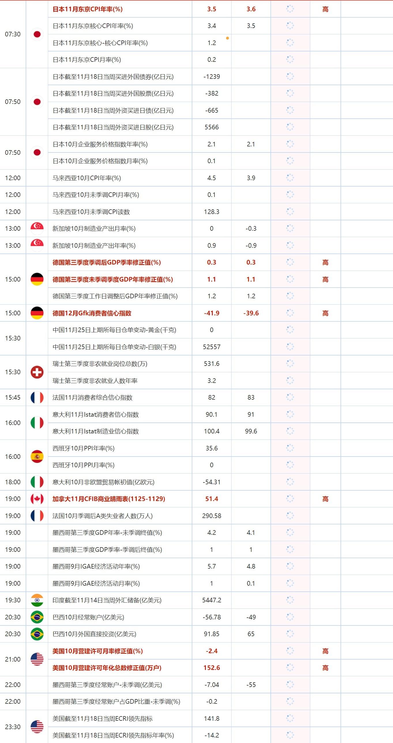 11月25日,投资者需要关注的重点数据:日本11月东京CPI年率,日本11月东京核心CPI年率,德国第三季度季调后GDP季率修正值,德国第三季度未季调季度GDP年率修正值 ,以及德国12月Gfk消费者信心指数。需要关注的大事件包括欧洲央行管委穆勒和维斯科发表讲话,北约秘书长斯托尔滕贝格召开记者会。