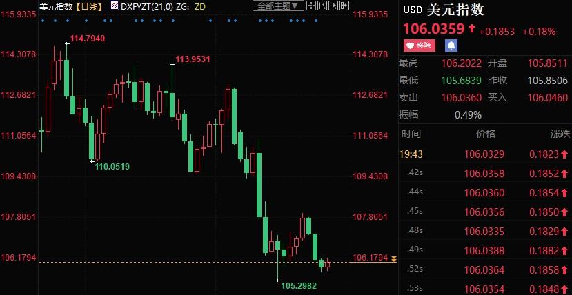 截止发稿,现货黄金上浮0.18%至1752.71美元/盎司;美元指数下跌0.90%至106.037。