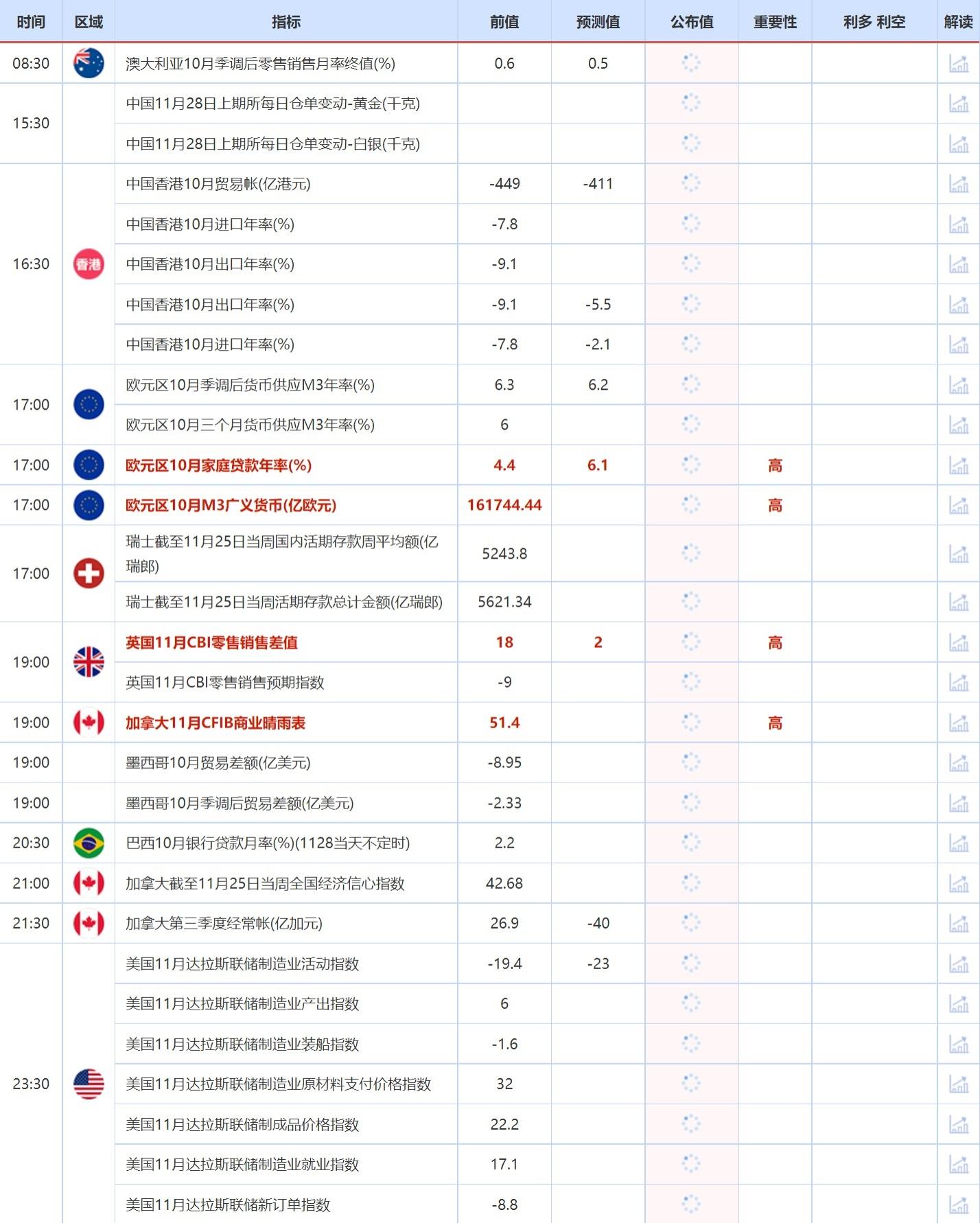 11月28日,投资者需要关注的重点数据:欧元区10月家庭贷款年率,欧元区10月家庭贷款年率,英国11月CBI零售销售差值,加拿大截至11月25日当周全国经济信心指数,加拿大第三季度经常帐和美国11月达拉斯联储制造业活动指数。需要关注的大事件包括欧洲央行管委诺特发表讲话, 欧洲央行行长拉加德发表讲话。