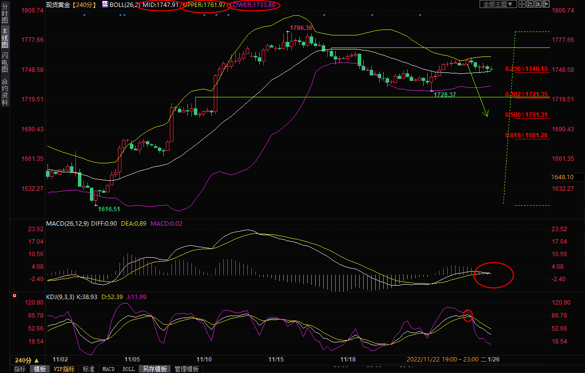 4小时级别:震荡;布林线轨道接近水平运行,留意布林线轨道1733.86-1761.98区域突破情况,目前MACD有死叉趋势,KDJ死叉,如果跌破布林线中轨1747.91附近支撑,则金价可能会进一步试探布林线下轨1733.86附近支撑,如果进一步下破,则增加后市看空信号;进一步较强的支撑在1616-1786涨势的38.2%回撤位1721.35附近。
