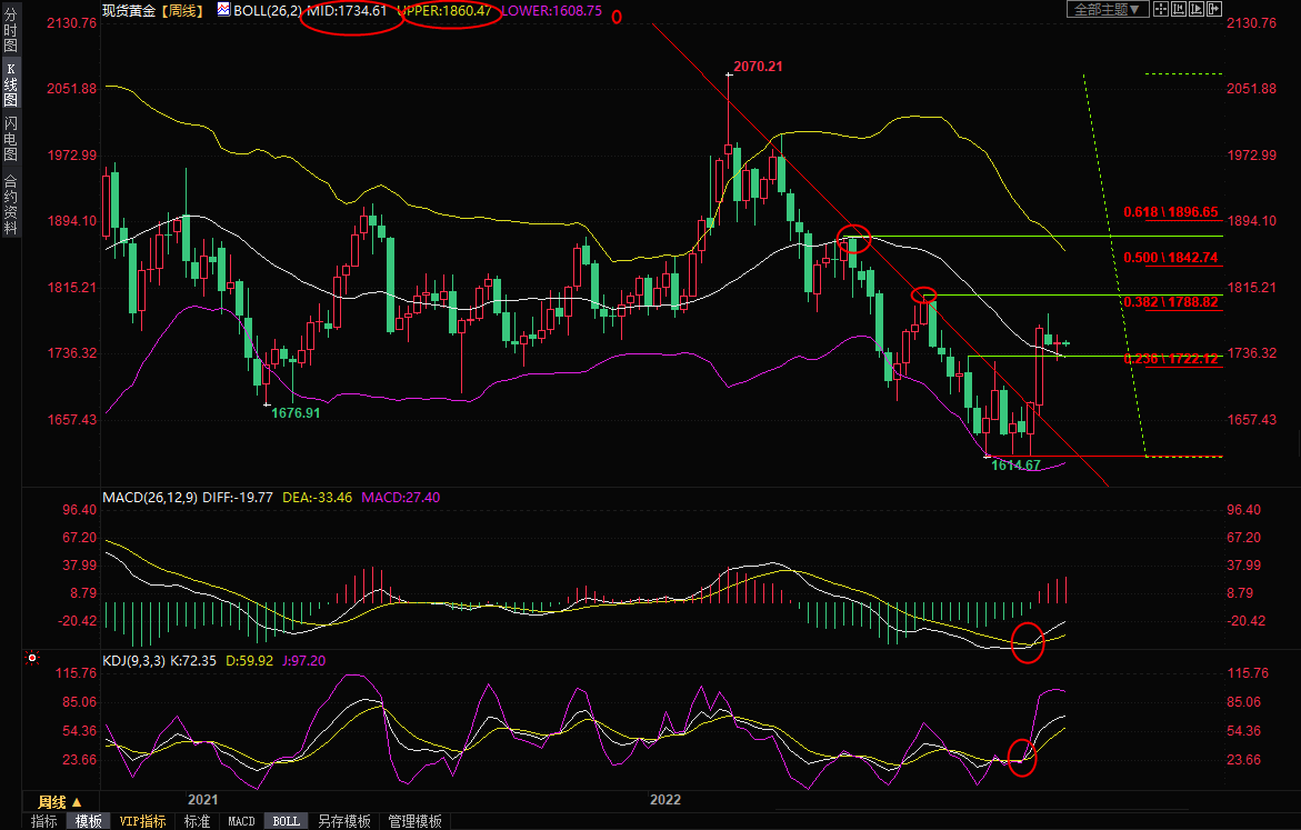 周线级别:单边下跌后反弹;MACD金叉,KDJ金叉,金价在1615附近反弹,顶破了下行趋势线阻力,并顶破了布林线中轨阻力,后市有望进一步涨向布林线上轨,目前该阻力在1860.47附近;此外,8月高点1807.72附近也存在一定的阻力。