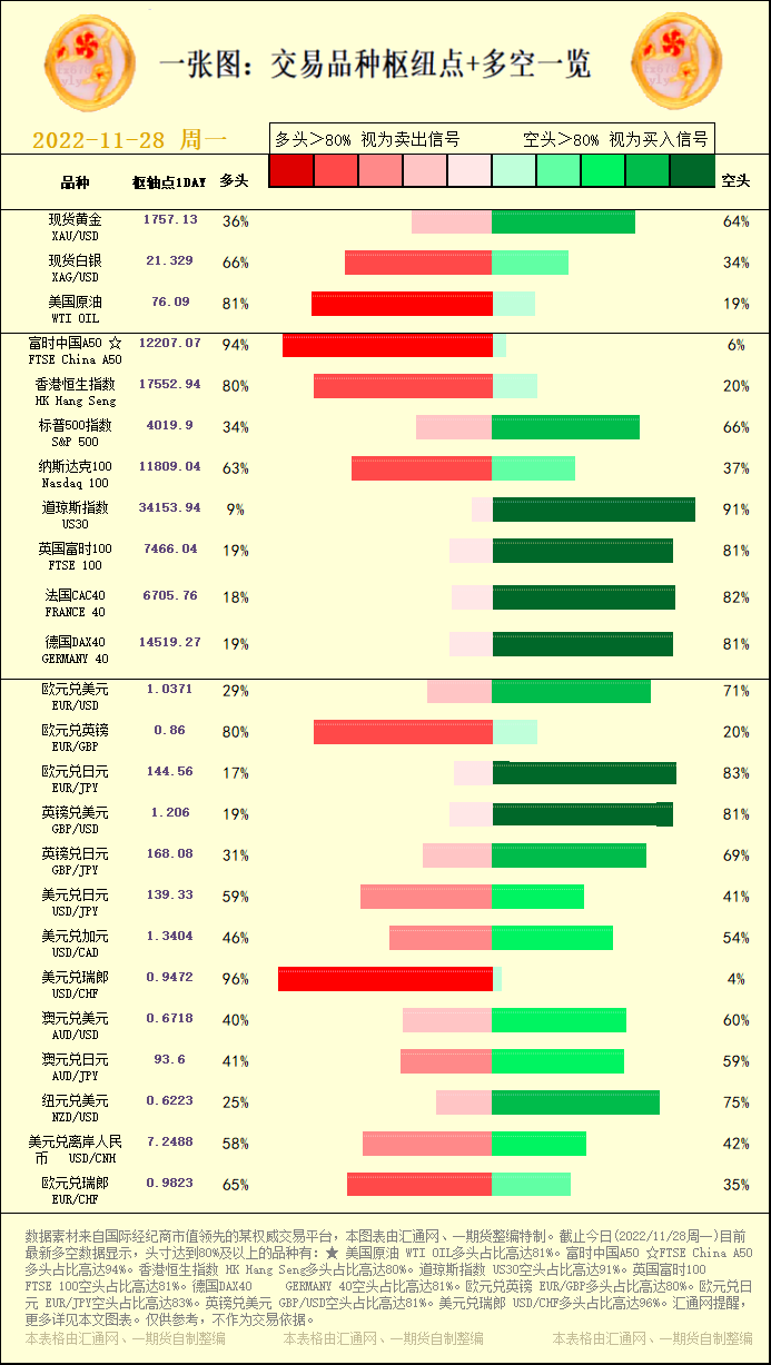一张图:交易品种枢纽点+多空占比一览。截止今日(2022/11/28周一)目前最新多空数据显示,头寸达到80%及以上的品种有:★ 美国原油 WTI OIL多头占比高达81%。富时中国A50 ☆FTSE China A50多头占比高达94%。香港恒生指数 HK Hang Seng多头占比高达80%。道琼斯指数 US30空头占比高达91%。英国富时100 FTSE 100空头占比高达81%。德国DAX40 GERMANY 40空头占比高达81%。欧元兑英镑 EUR/GBP多头占比高达80%。欧元兑日元 EUR/JPY空头占比高达83%。英镑兑美元 GBP/USD空头占比高达81%。美元兑瑞郎 USD/CHF多头占比高达96%。汇通网提醒,更多详见本文图表。仅供参考,不作为交易依据。