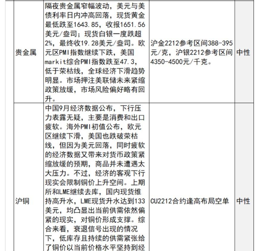 中国9月原油进口增加,原油加工量升至多月高点,因中国积极加工原油出口成品油。当日公布的美国10月制造业PMI数据也跌破50关口,至此全球三大经济体中美欧的PMI都处于收缩格局。隔夜贵金属窄幅波动,美元与美债利率日内冲高回落,现货黄金最低跌至1643.85,收报1651.56美元/盎司;现货白银一度跌超2%,最终收19.28美元/盎司。
