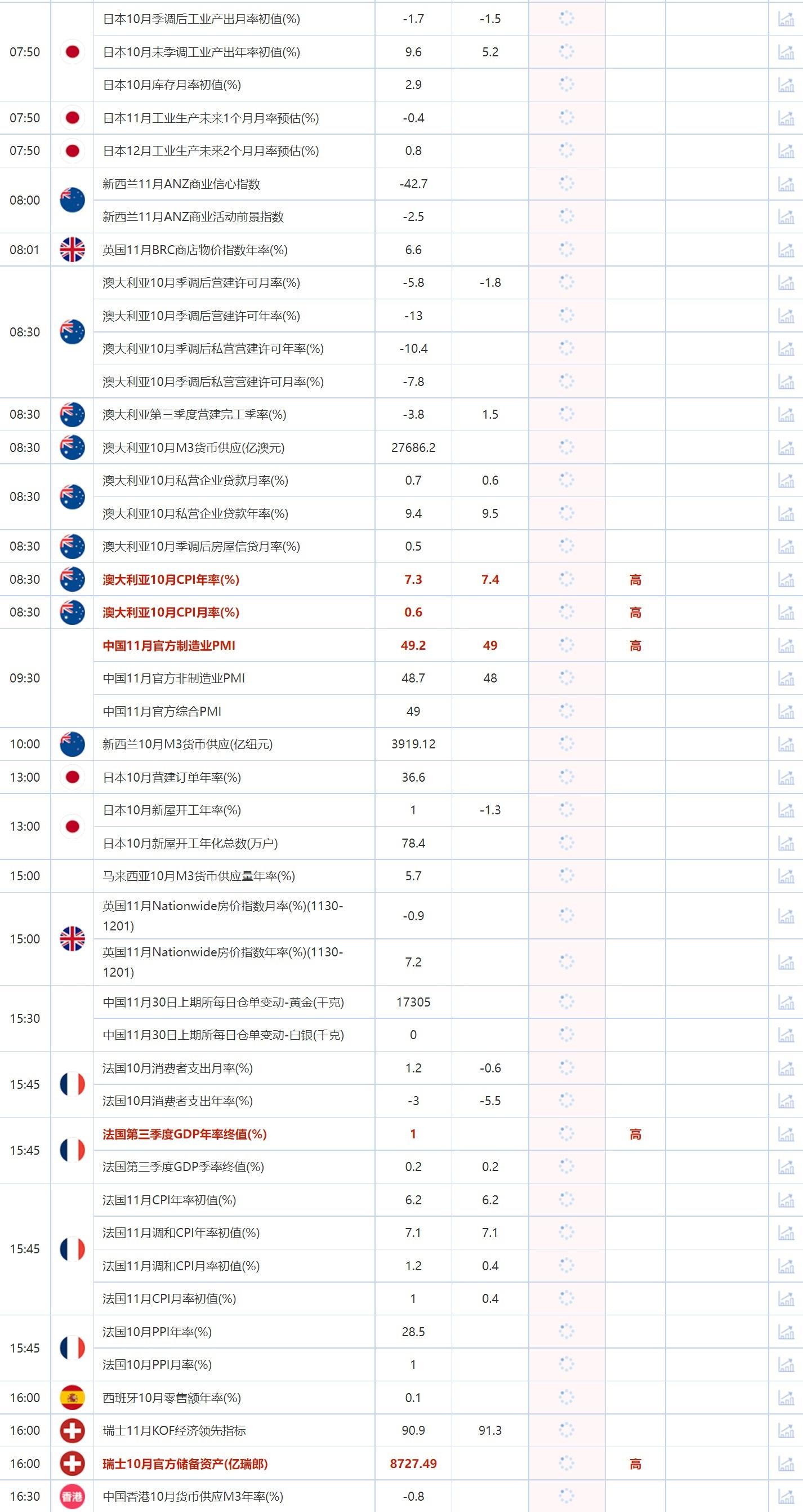08:30 澳大利亚10月CPI年率(%) , 前值 7.3 , 预期值 7.4 , 公布值:待发布