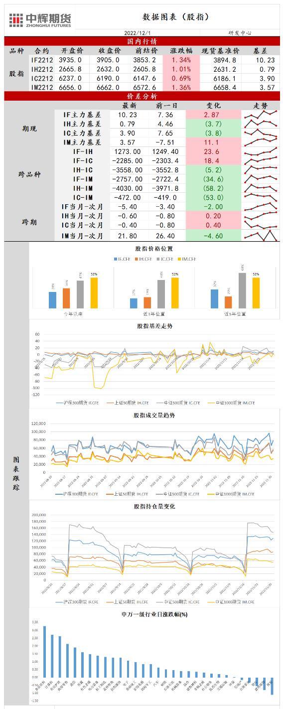 2、受隔夜外盘大涨以及国内各地防疫政策放松的影响,市场信心提振,三大指数集体高开,全天高位窄幅震荡,尾盘回落回吐涨幅。疫后消费复苏主导市场情绪,大消费板块表现较好,连续调整多日的信创板块午后反弹,热点轮动的格局未变,沪指面临半年线的压力位。两市成交额重回万亿上方,交投活跃度升温,北向资金全天大幅净流入超100亿元。隔夜美股集体收涨,早盘窄幅震荡午后鲍威尔暗示12月放缓加息,三大指数快速拉升,纳指涨超4%。昨日鲍威尔的公开表态中重申遏制高通胀需要继续加息的立场,但也暗示最快将于12月放缓加息步伐,美联储不希望连续加息破坏经济,官员们希望避免过度紧缩,此次讲话是美联储12月会议静默期前的最后一次公开表态,市场预计12月加息50个基点为板上钉钉。美元指数和美债收益率盘中跳水,2年期美债收益率一度较日内高位回落超过20个基点,基准10年期美债收益率较日高降逾10个基点。美国小非农数据显示,11月ADP私人部门新增就业人数远低于预期,新增人数创近两年来新低,就业人员薪资连续两个月同比增长放缓,连续大幅加息已给劳动力市场带来影响,进一步强化美联储放缓加息的预期。三季度实际GDP年化季环比增速上修,高于预期,但剔除物价变动的GDP平减指数和PCE物价指数超预期上修,未来通胀能否延续回落增添了不确定性。但10月美国JOLTS空缺职位数略超预期下降,总量仍处于较高水平,显示劳动力市场仍有韧性。国内11月财新和官方制造业PMI均处于荣枯线下方,分项数据显示供需双弱的局面尚未得到改善,疫情对经济活动的扰动仍大。但近期国内各地疫情政策优化调整,常态化防疫进入新阶段。广州多区宣布解除疫情防控临时管控区,进出商场查验健康码无需查看48小时核酸报告,北京无社会面活动人员可不参加社区核酸检测,重庆中心城区逐步放开,石家庄多区有序恢复生产生活秩序等等。防疫和地产利好政策不断,市场人气回暖,资金净流入明显并对指数形成支撑。随着宏观预期的改善,预计IF和IH表现将优于IC和IM。申万一级31个行业中26个行业上涨,其中食品饮料行业领涨,煤炭行业领跌。