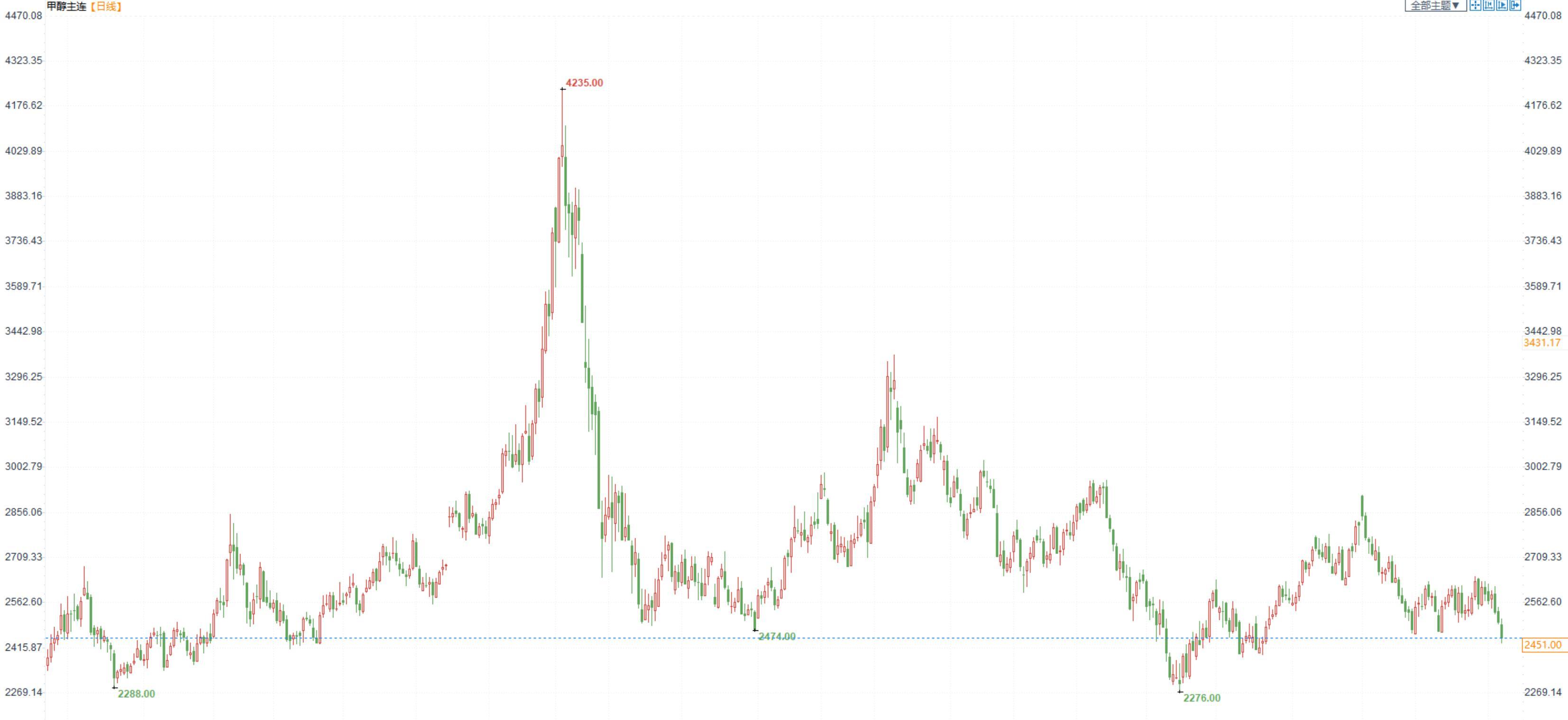 期货市场,甲醇2301合约跌超2%,收盘价2451。现货端,港口库存较低,目前现货强势于期货。