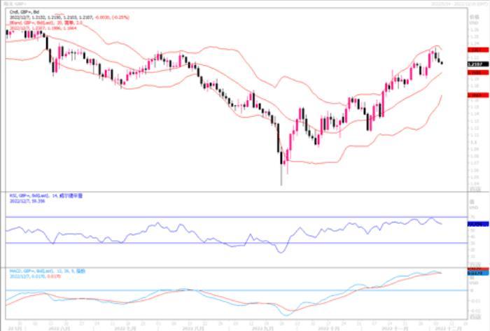 周二(12月6日),英镑兑美元连续第二个交易日下跌,收盘于1.2130。美国供应管理协会(ISM)表示,其非制造业采购经理人指数(PMI)从10月的54.4上升至上个月的56.5,表明占美国经济活动三分之二以上的服务业在利率攀升的情况下仍具有韧性。数据稍稍刺激美元指数平复近几个交易日的跌幅。而根据瑞银分析师在一份报告中说,预计英国央行将在下周的会议上将加息步伐从11月的75个基点放缓至50个基点,因中期通胀预期和劳动力需求显示出放缓迹象。由于12月就业市场报告和11月CPI数据没有出现重大意外,我们预计货币政策委员会多数成员将投票支持小幅加息。在欧美央行普遍被预期将在12月降低加息幅度的影响下,英镑对美元近期大幅走高的步伐也出现了暂时的停歇。日线图上,镑美暂时仍保持在20日均线上方,但各类技术指标由拐头下行迹象;4小时短线图上,汇价更是低落于各短期均线下方,MACD绿色动能柱开始发散。近期还是要主防英镑对美元继续回落调整的风险,下方关键的支撑在1.21-1.20区域,若失守,英镑转入下跌轨道风险增高。