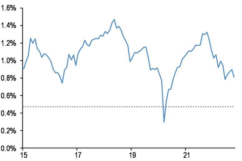 纽交所保证金账户的净借方余额处于较低水平