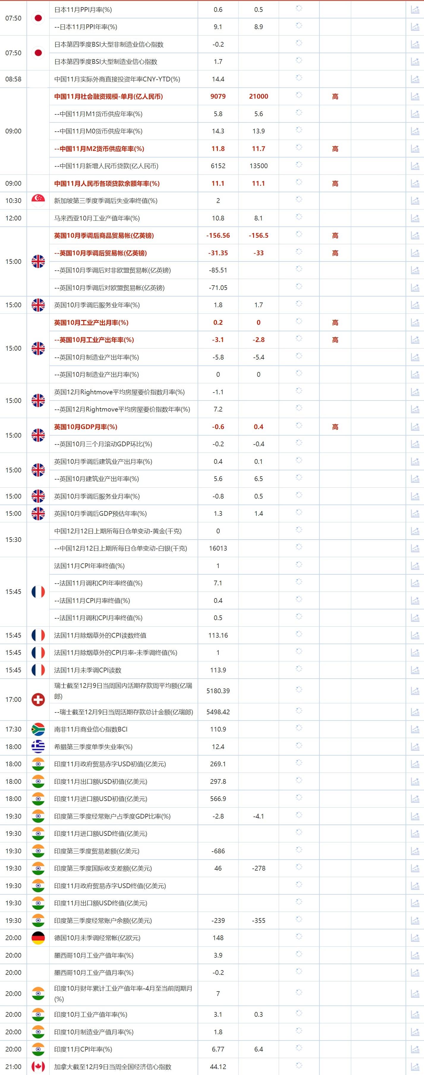 09:00 --中国11月M2货币供应年率(%) , 前值 11.8 , 预期值 11.7 , 公布值:待发布