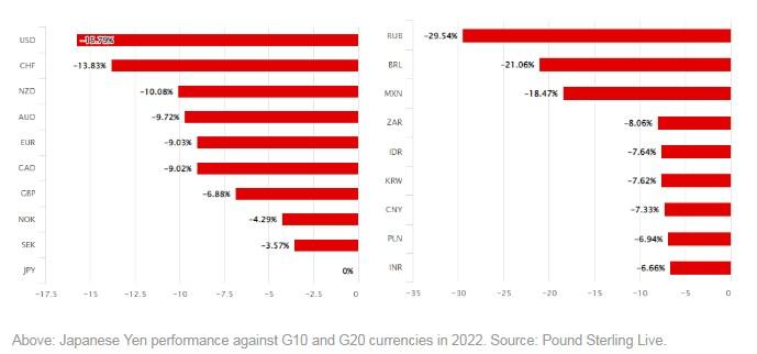 日元兑美元今年仍下跌逾15%,而与G10的发达市场同行相比,日元兑瑞士法郎和纽元的汇率也出现了两位数的百分比跌幅。