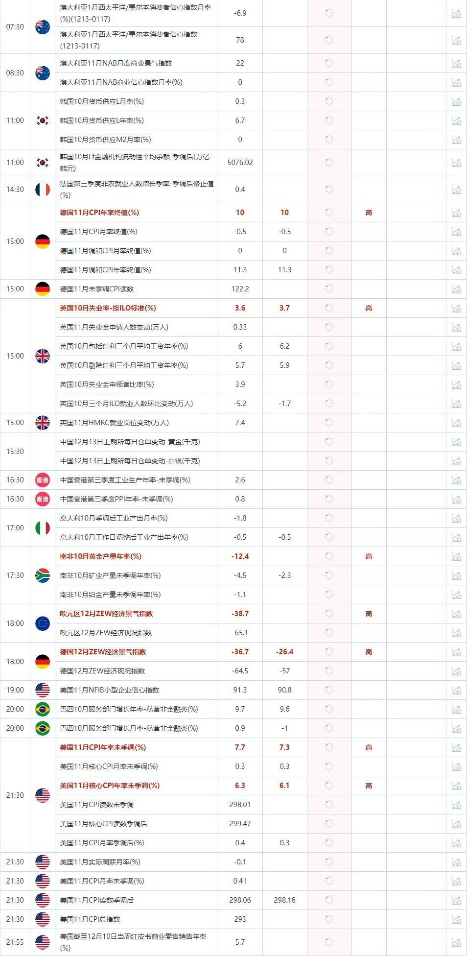 21:30 美国11月CPI年率未季调(%) , 前值 7.7 , 预期值 7.3 , 公布值:待发布