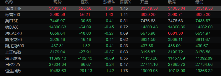 美股收盘情况: 道琼斯工业指数上涨1.58%,报34005.04点;标普500指数上涨1.43%,报3990.56点;纳斯达克指数攀升1.26%,报11143.74点。